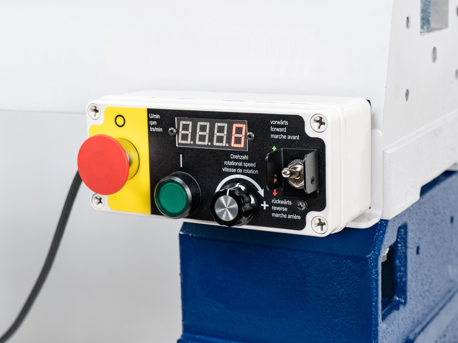 - Pupitre de commande magnétique : les boutons marche/arrêt, de modulation de vitesse et du sens de rotation sont concentrés sur un boîtier magnétique accrochable partout sur le tour. Un système confortable et ergonomique !