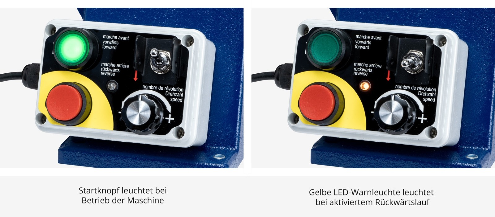 L'interrupteur de freinage à 2 étages (vitesse lente / vitesse standard) permet d'adapter la vitesse de freinage de la broche : un temps de freinage plus long accroit la sécurité pour ralentir la rotation des pièces volumineuses et mal équilibrées.