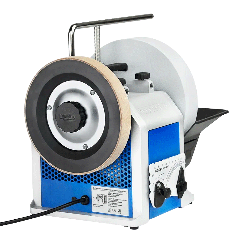 Le bac à eau a été encore amélioré avec une vis de réglage pour une installation simplifiée. Il possède aussi un racloir magnétique à double fonction : pendant l'affûtage, l'aimant recueille les particules d'acier et après l'affûtage, le racloir simplifiera le nettoyage du bac à eau.